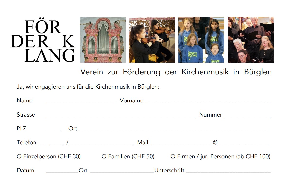 Diese E-Mail-Adresse ist vor Spambots geschützt! Zur Anzeige muss JavaScript eingeschaltet sein. oder mit Briefpost an Förderklang Bürglen, c/o Heinz Walker Schächenwaldstrasse 97, 6460 Altdorf.